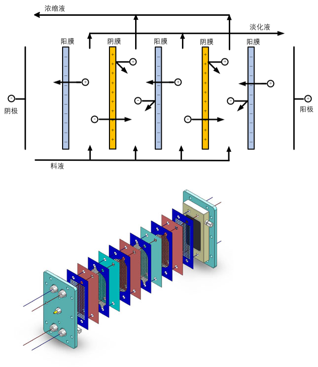 用1張陰離子交換膜、1張淡化室隔板、1張陽離子交換膜和1張濃縮室隔板的交替疊放構(gòu)成了1個(gè)膜對(duì); 若干膜對(duì)疊放一起,兩側(cè)加上電極室隔板則構(gòu)成了膜堆;膜堆兩側(cè)放置電極、配水板及夾緊板則構(gòu)成了電滲析器。