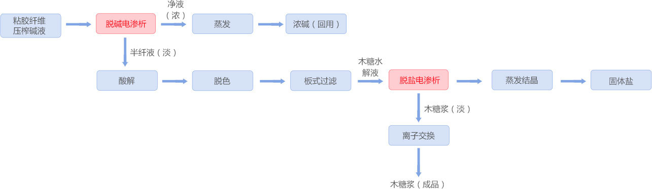 粘膠纖維生產(chǎn)過程中產(chǎn)生大量壓榨廢堿液,以前轉(zhuǎn)移到污水處理廠用酸中和,不僅產(chǎn)生大量固廢,而且造成資源浪費。采用均相膜電滲析裝置,壓榨堿液經(jīng)電滲析脫堿回用,脫堿后的半纖經(jīng)酸解、電滲析脫鹽凈化后生產(chǎn)木糖,該工藝是工業(yè)廢棄物資源化利用并實現(xiàn)廢水零排放的典型案例。該項目已連續(xù)運行兩年,全年可實現(xiàn)20萬噸高含量半纖維素堿法漿處理回用,對傳統(tǒng)產(chǎn)業(yè)工藝綠色化改造具有重要意義。