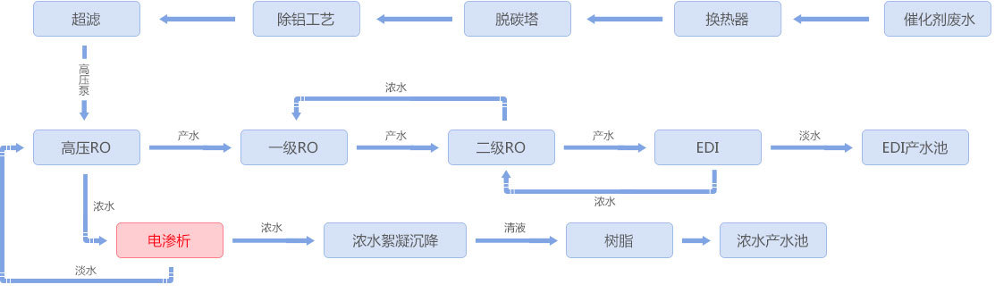 稀土氧化物催化劑生產(chǎn)過程中會產(chǎn)生大量3-5%硝酸鈉廢水,采用均相膜電滲析裝置將硝酸鈉濃縮到20%以上進(jìn)入蒸發(fā)系統(tǒng),淡水經(jīng)反滲透處理后回用。該均相膜電滲析產(chǎn)品解決了異相膜和部分進(jìn)口均相膜濃縮倍數(shù)不高、不耐金屬離子污染的問題,同時實現(xiàn)含硝酸鈉廢水零排放及資源化利用。